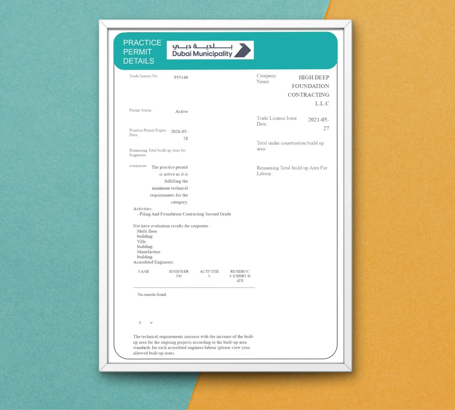Authorization granted by the Dubai Municipality to High Deep Foundation Contracting L.L.C. to lawfully engage in and execute building and foundation contracting activities within the Emirate of Dubai. This license permits the company to undertake structural construction, foundation works, and related civil engineering projects in compliance with local regulations, safety standards, and municipal construction codes. It certifies that the firm meets all professional, technical, and regulatory requirements necessary to operate as a qualified contractor in Dubai’s construction sector.