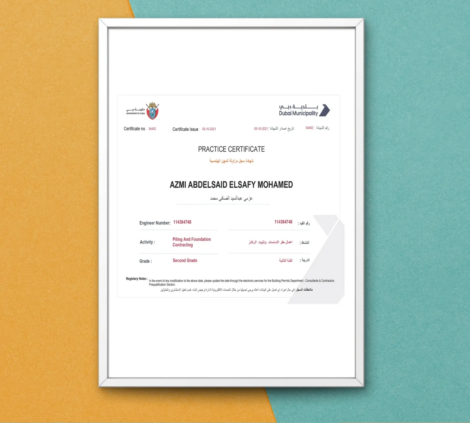 This certificate authorizes Engineer Azmi Abdelsaid Elsafy Mohamed to professionally practice within the field of Piling and Foundations Contracting in the Emirate of Dubai. It confirms the engineer’s qualification, technical competence, and compliance with the Dubai Municipality’s engineering standards and safety regulations. The certification enables the holder to oversee, design, and execute specialized foundation and piling works, ensuring adherence to quality construction practices and the city’s regulatory framework.