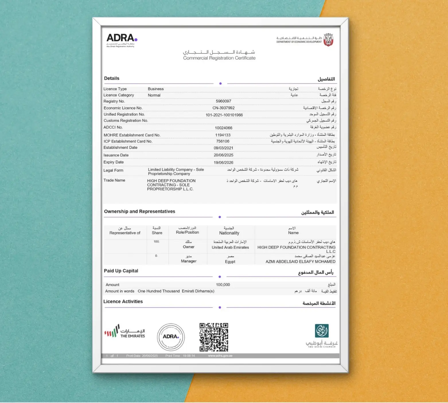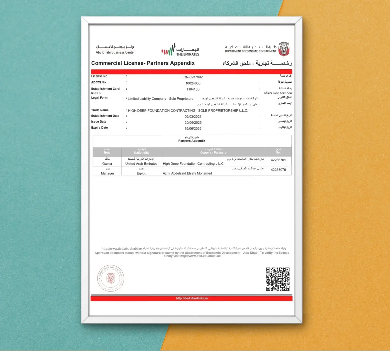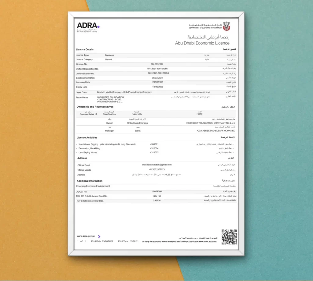 This commercial license authorizes High Deep Foundation Contracting Sole Proprietorship L.L.C. to legally operate as a contracting and engineering services company within the Emirate of Abu Dhabi. It validates the company’s registration under the Abu Dhabi Department of Economic Development and its compliance with the emirate’s business regulations. The license affirms the company’s legal capacity to execute foundation and structural contracting projects, participate in construction tenders, and engage in professional engineering activities in accordance with UAE commercial laws and professional standards.