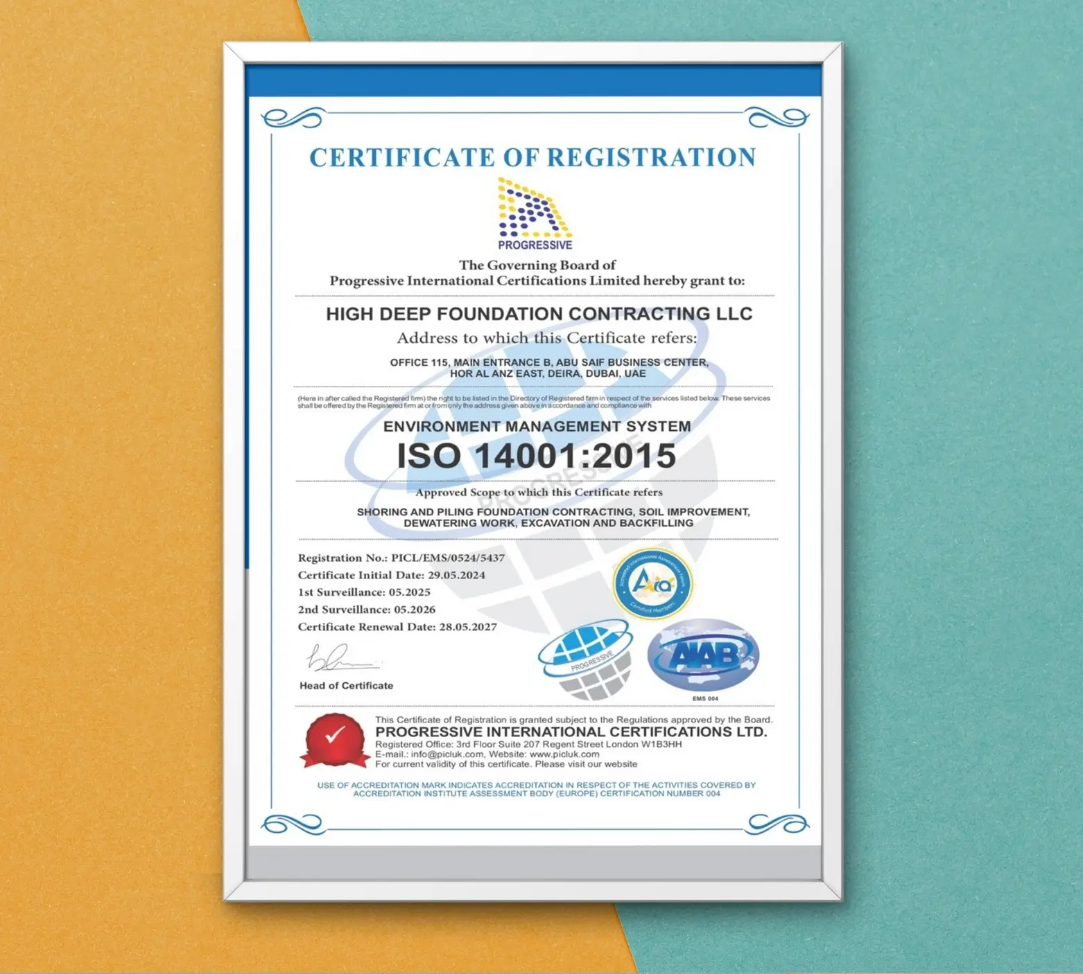 This certification demonstrates that High Deep Foundation Contracting L.L.C. operates in compliance with the ISO 14001:2015 Environmental Management System standards, emphasizing environmental responsibility and sustainable construction practices. The certification recognizes the company’s structured approach to minimizing environmental impact, efficient resource use, and continuous improvement in its environmental performance. It assures clients and partners that the firm’s operations align with international environmental management standards, contributing to eco-friendly and sustainable project execution within the UAE construction sector.