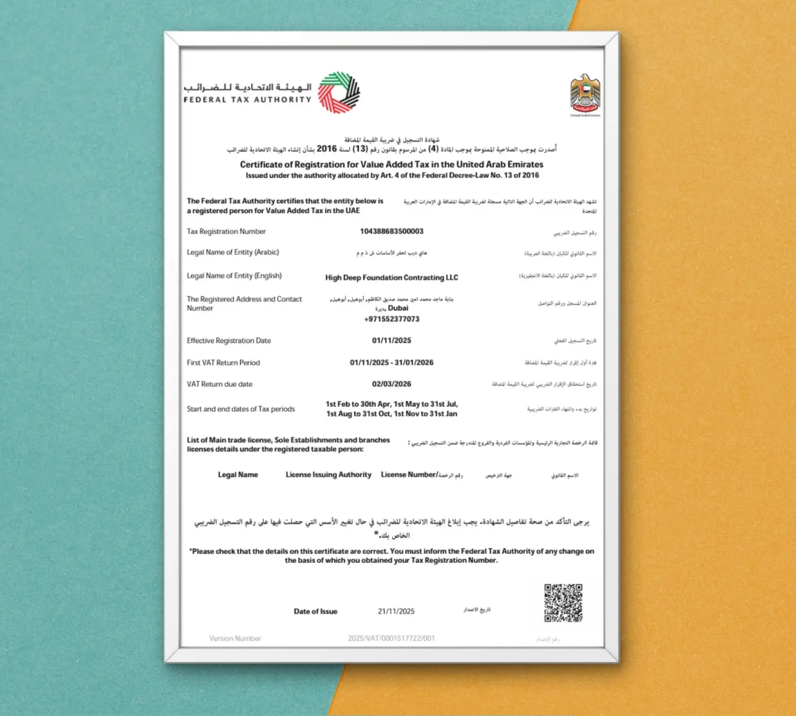 This certificate confirms that High Deep Foundation Contracting L.L.C. is officially registered under the Federal Tax Authority (FTA) for the collection and remittance of Value Added Tax (VAT) in the United Arab Emirates. The registration ensures the company’s compliance with federal tax laws and regulations, enabling it to issue VAT-compliant tax invoices and participate in government and commercial projects that require VAT registration. It reflects the company’s commitment to financial transparency, lawful operations, and adherence to the UAE’s fiscal governance framework.