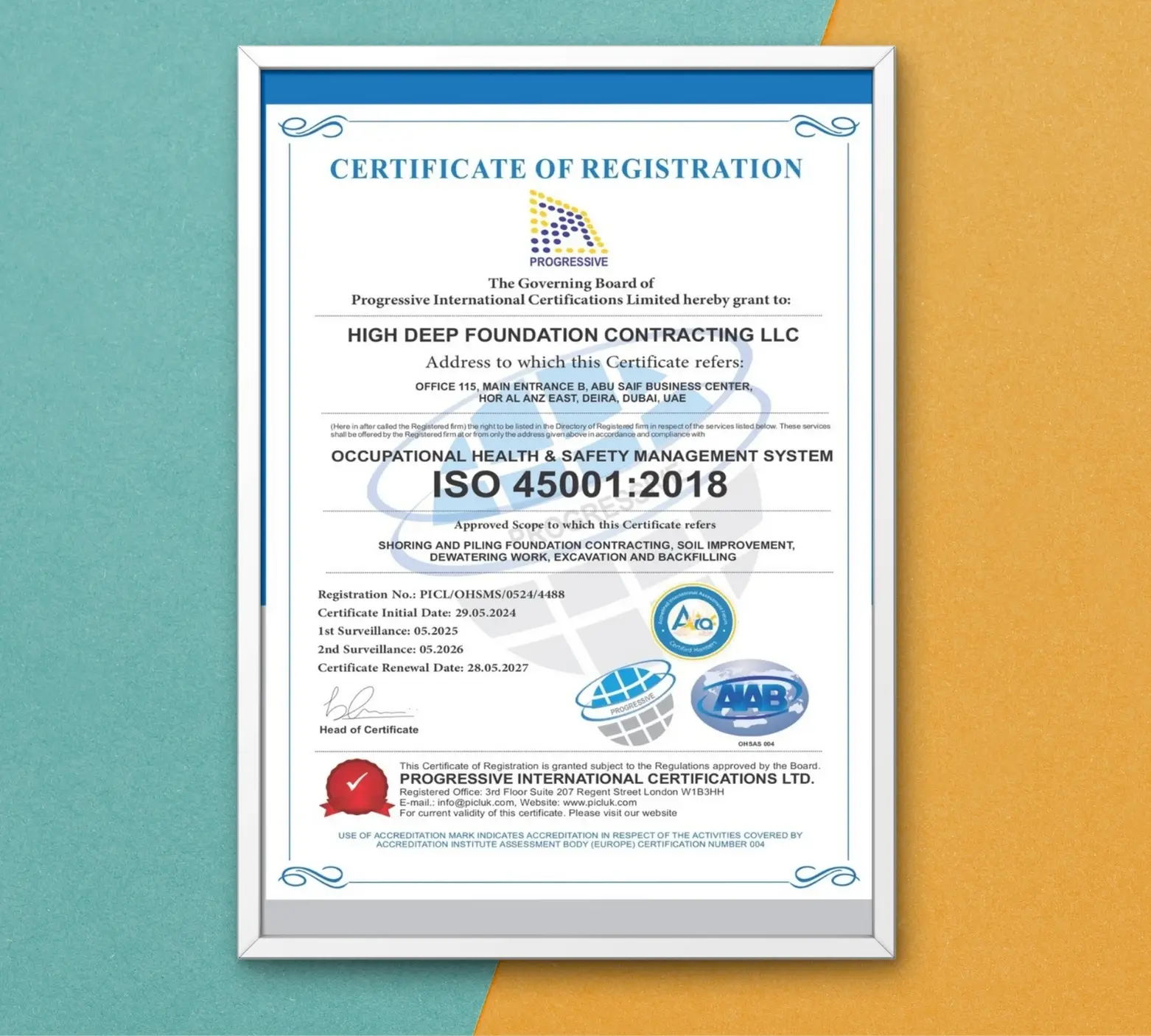 This certification confirms that High Deep Foundation Contracting L.L.C. has established and maintains an Occupational Health and Safety Management System compliant with ISO 45001:2018 standards. It demonstrates the company’s strong commitment to protecting employees, preventing workplace hazards, and continuously improving health and safety performance across all projects. The certification highlights the firm’s adherence to internationally recognized safety procedures, ensuring a secure and responsible working environment throughout all foundation and construction operations in the UAE.