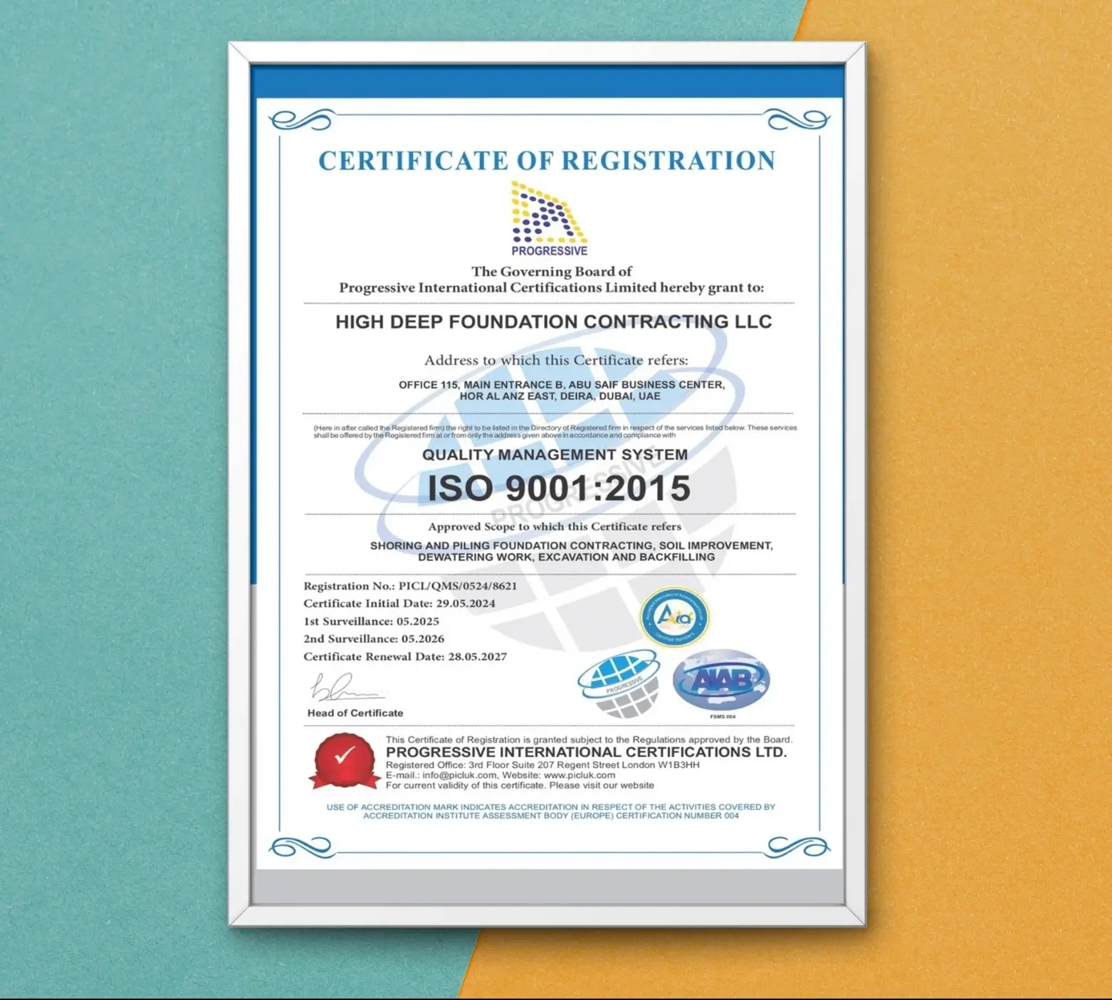 This certificate acknowledges that High Deep Foundation Contracting L.L.C. maintains a Quality Management System (QMS) in accordance with the ISO 9001:2015 international standard. It confirms that the company consistently meets client and regulatory requirements through structured quality control, risk management, and continuous process improvement. The certification underscores the firm’s dedication to delivering superior workmanship, customer satisfaction, and operational excellence across all foundation and construction projects in the UAE.